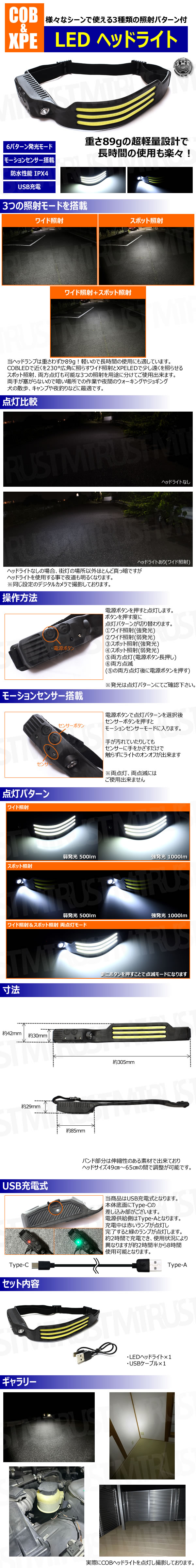 商品名 : COB & XPE LED ヘッドライト【6パターン発光 モーション センサー IPX4 防水 超軽量 USB 充電 ヘッドランプ ワイド照射 スポット照射 アウトドア キャンプ 登山 作業 車 修理 ウォーキング ジョギング 犬の散歩 釣り 夜 夜間 防災 停電 】【エムトラ】